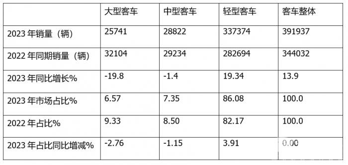 根据中国汽车流通协会提供的国内客车实际销售数据(不含出口,下同),2023年国内三类客车(含轻客、中客、大客)累计实际销售391937辆(含轻客337374辆+中客28822辆+大客25741辆),同比2022年的344032辆(含轻客282694辆+中客29234辆+大客32104辆)增长13.9%(具体见截图1、截图2),可见2023年客车终端市场实际销量比2022年同期增长1成多,说明2023年国内客车市场实际需求与2022年同期比较有一定程度的改善。