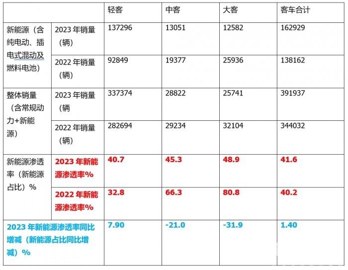 上表显示:在2023年新能源客车整体市场渗透率为41.6%,比2022年同期增长1.4个百分点;其中三大类新能源客车市场渗透率呈现以下特征: