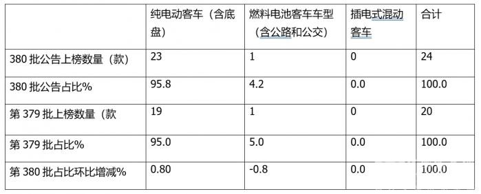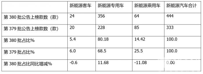 表2,根据工信部第380批公告统计数据,按技术路线划分,各车型上榜数量占比及占比环比增减: