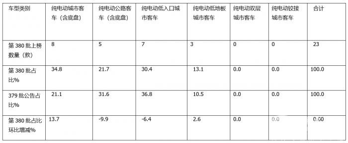 表3,根据第380批公告数据,按目标用途划分上榜的23款纯电动客车车型类别结构占比及占比环比增减统计:
