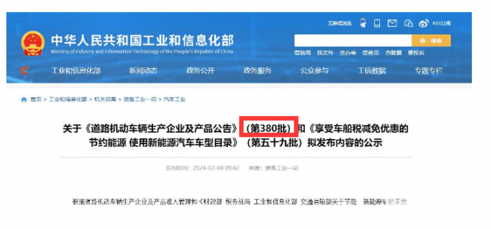2024年2月4日,工信部发布关于《道路机动车辆生产企业及产品公告》(第380批公告,下也称本批次公告),这是2024年以来工信部发布的第2批汽车新车产品公告。