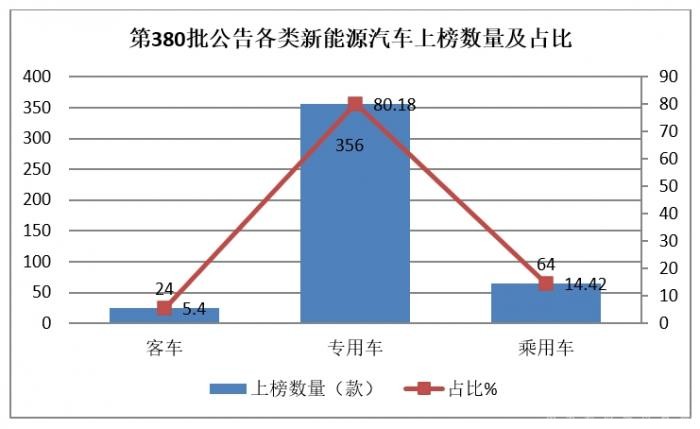 按汽车大类划分,第380批公告中上榜的新能源车型中,包括新能源客车24款,占比5.4%;新能源乘用车上榜64款,占比14.42.%;新能源专用车上榜356款,占比80.18%。
