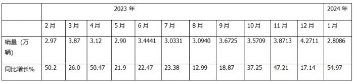 表1,根据中汽协数据,2023年2月—2024年1月各月轻客销量及同比统计: