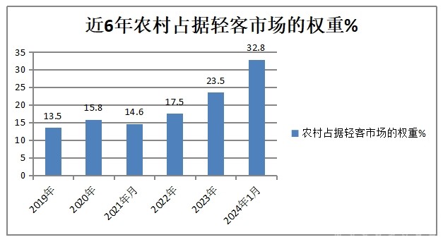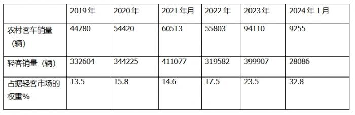 表2,根据终端上牌及中汽协数据显示,2024年1月及近年农村客车市场销量(含5—7米段)及占据轻客市场的比例统计如下: