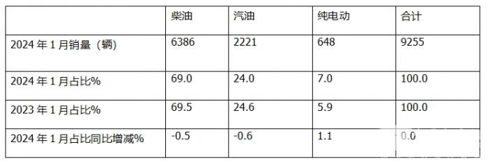 表3,2024年1月按燃料种类划分,农村客车市场占比(数据来源:终端上牌信息)