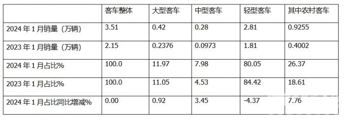 表1,2024年1月农村客车与轻客及客车大盘增速比较(数据来源:中汽协及终端上牌信息)