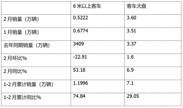 另外,今年前2月6米以上客车累计销售11996辆,累计同比增长74.84%,远远跑赢今年前2月客车大盘累计同比29.05%的增速。