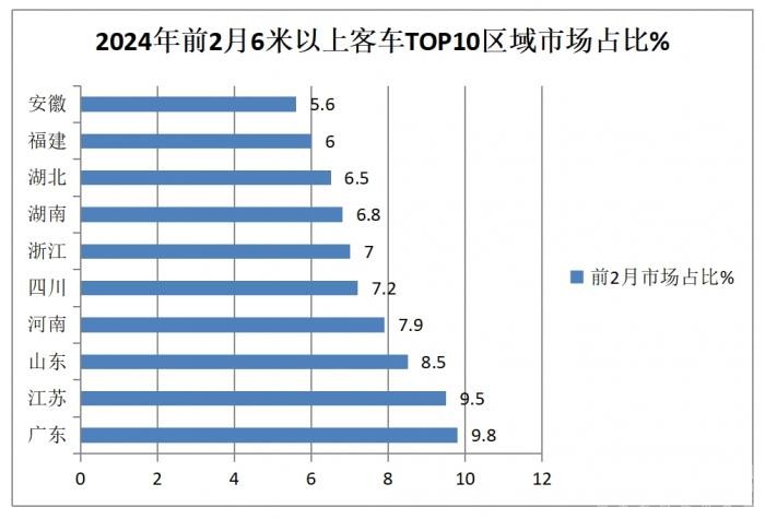 根据终端上牌数据,2024年前2月6米以上客车终端市场TOP10区域占比: