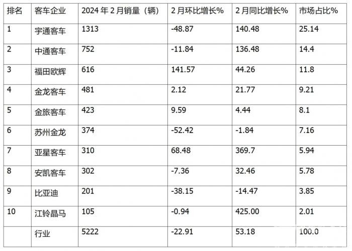 整体看,在2024年前2月6米以上大中型客车市场中,宇通霸榜;中通、苏州金龙分别居第二、第三;TOP10同比8增2降,江铃晶马领涨(653.57%);