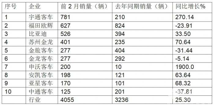 二、前2月累销:宇通第一,福田欧辉比亚迪分列二三;TOP10同比6增4降,申沃领涨