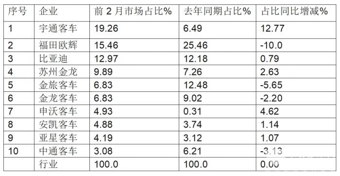 三、前2月:TOP10市场占:6增4减,宇通占比同比增加最多
