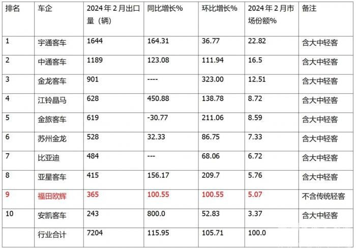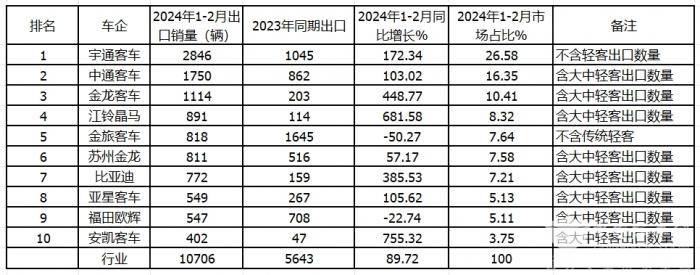 表1,根据中国客车统计信息网数据,2024年2月客车出口TOP10排行: