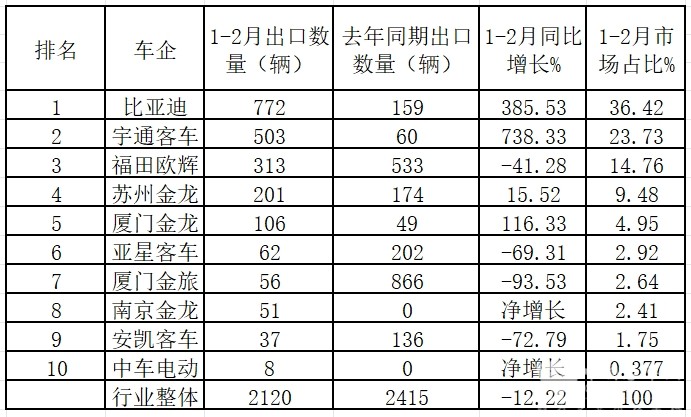 四、从前2月累计出口竞争格局看,比亚迪霸榜;宇通、福田欧辉分别居第二、第三;宇通客车领涨Top 10