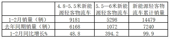 可见2024年1-2月新能源轻客物流车累计销售14479辆,累计同比近乎翻倍涨(99.9%)。具体统计如下表: