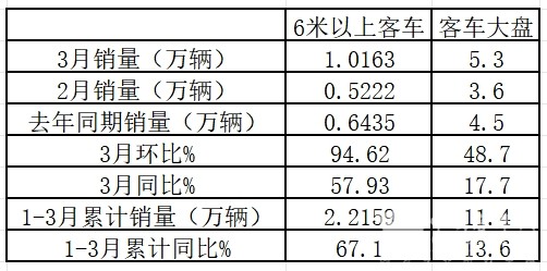 另外,今年前3月6米以上客车累计销售22159辆,累计同比增长67.1%,远远跑赢今年前3月客车大盘累计同比13.6%的增速。