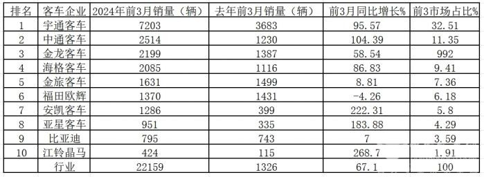 整体看,在2024年前3月6米以上大中型客车市场中,中通、金龙分别居第二、第三;TOP10同比9增1降,江铃晶马领涨.