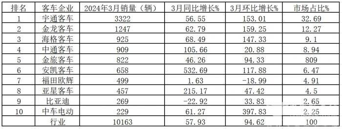 表1,根据中国客车统计信息网和中汽协数据,2024年3月6米以上客车销量同环比与今年3月客车大盘比较: