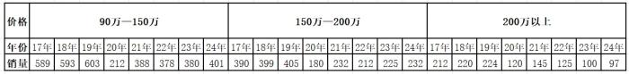 二、从价格细分区间看,90-150万价格区段销量最大;200万以上价格区间销量最少,也是唯一同比下降的区间