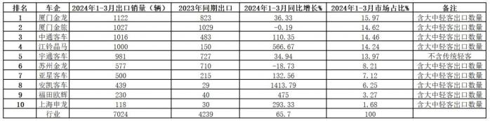 表2,根据中国客车统计信息网数据,2024年1-3月座位客车企业整体出口TOP10排行(不含轻客出口数量):
