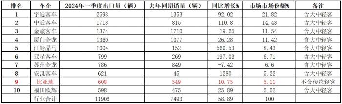 那么2024年一季度客车企业出口排行如何?