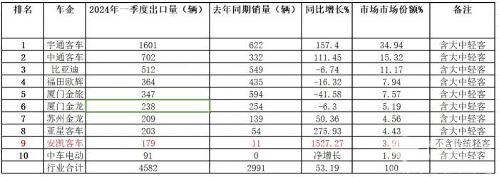 2024年一季度客车企业出口TOP10排行榜出炉 安凯领涨