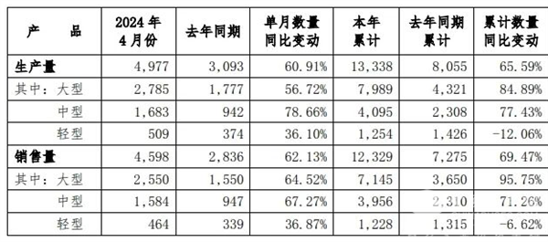 2024年4月亚星客车销售大型客车611辆,同比(去年4月大型客车销量为130辆)大涨370%,1-4月累计销售1304辆,累计同比增长542.36%;销售中型客39辆,同比(去年4月中型客车销售7辆)大涨457.14%,累计销售216辆,同比上升87.83%;实现销售轻型客车0辆,同比(去年4月销售轻型客车58辆)下降100%,累计销售87辆,同比下降61.79%。可以看到,亚星客车在大中型客车领域表现突出。