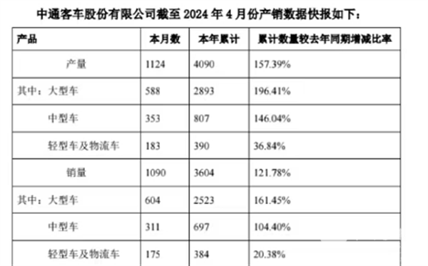 三、中通客车:4月销量同比增175.95%;1-4月累销同比涨121.78%