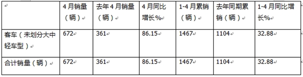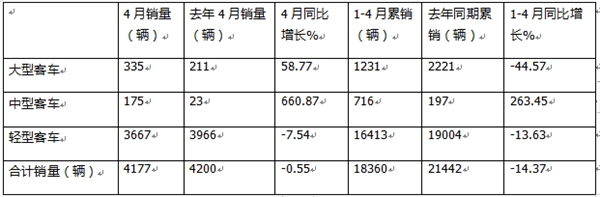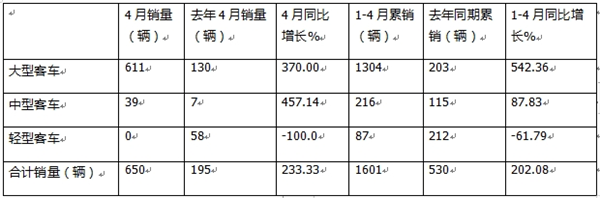 由于比亚迪产销快报未将客车销量具体分类,因此未知其4月及1-4月大中轻客车各细分市场具体销量及同比增长情况。总之,比亚迪客车今年4月及1-4月同比均增长,表现不俗。