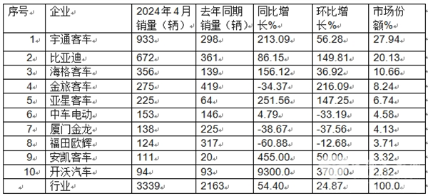 表4:2024年4月新能源客车销量同比与客车大盘比较(数据来源:客车统计信息网):