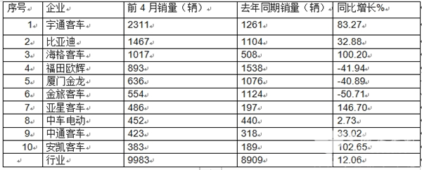二、前4月累销:宇通第一,比亚迪\海格分列二三;TOP10同比7增3降,亚星领涨