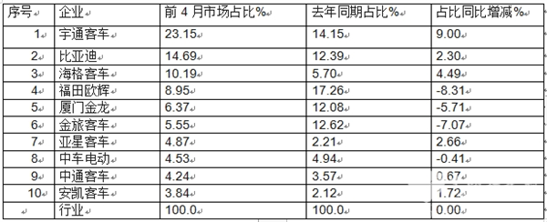 三、前4月:TOP10市场占比同比6增4减,宇通增加最多