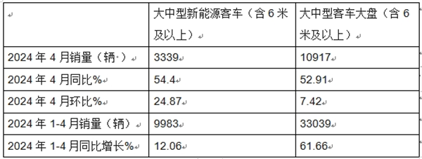 2024年1-4月6米以上大中型新能源客车同比增长12.06%,跑输1-4月6米以上大中型客车大盘同比61.66%的增速。