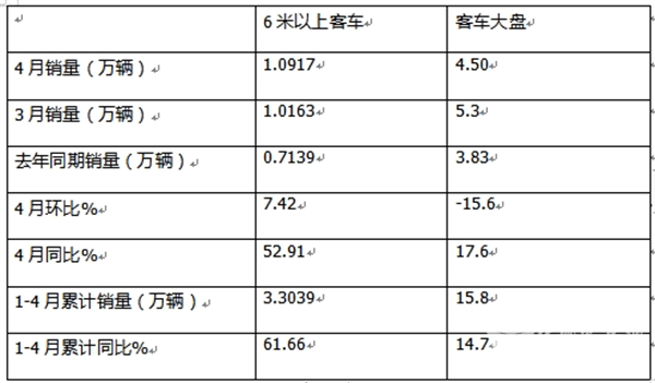 另外,今年前4月6米以上客车累计销售33039辆,累计同比增长61.66%,远远跑赢今年前4月客车大盘累计同比14.7%的增速。
