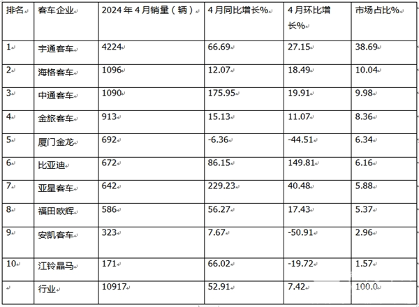 根据中国客车统计信息网数据,2024年4月6米以上客车top10销量排行: