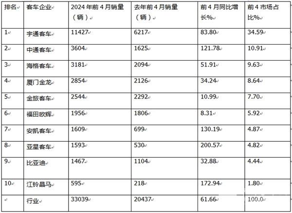 整体看,在2024年前4月6米以上大中型客车市场中,宇通独大,中通、海格分别居第二、第三;TOP10同比全线增长,亚星客车领涨(200.57%)。