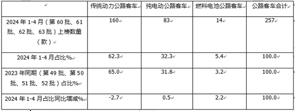 一、前4月发布的4个批次公告特点:传统公路客车占主体地位,但同比主体地位减弱;纯电动公路客车和燃料电池公路客车地位同比均有不同程度提升,其中燃料电池公路客车提升最快