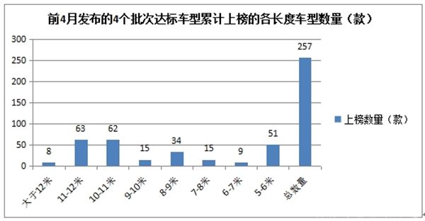 1、根据交通部数据,2024年前4月发布的4个批次达标车型公告累计上榜的各个长度段的公路客车数量: