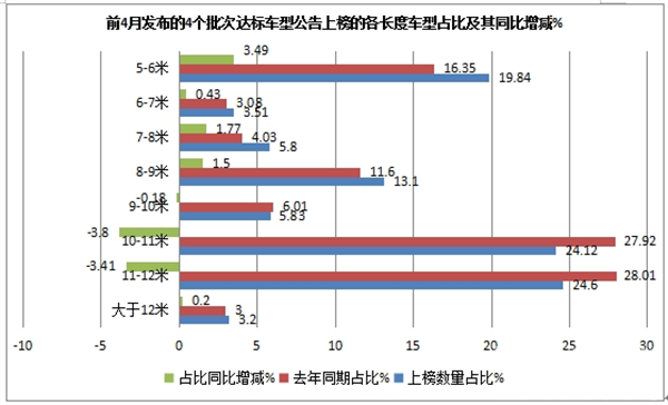 从上面两图可见,2024年前4月公路客车达标公告中各长度段车型上榜数量占比及占比同比增减呈现以下突出特征: