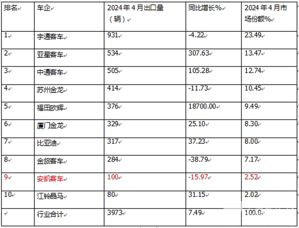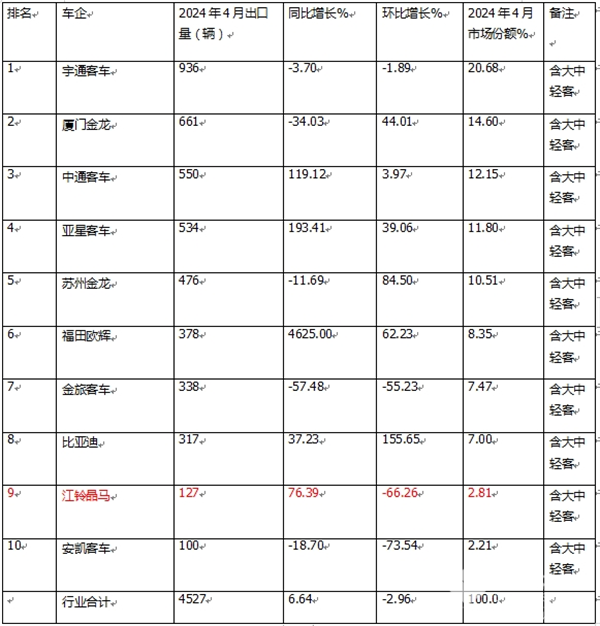 表1:根据中国客车统计信息网数据,2024年4月客车出口TOP10排行: