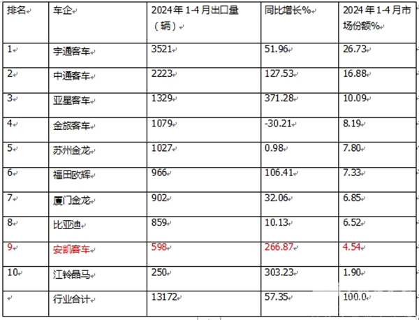 那么2024年4月及1-4月客车企业出口排行如何?