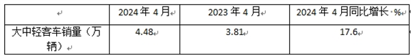 表1、2024年4月同比增长17.58%(数据来源:中汽协):