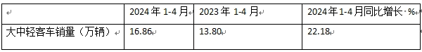 根据中汽协数据,2024年1-4月大中轻客车累计销售16.86万辆,同比增长22.18%,比今年一季度同比增幅扩大了6个多百分点,同比向好趋势明显。