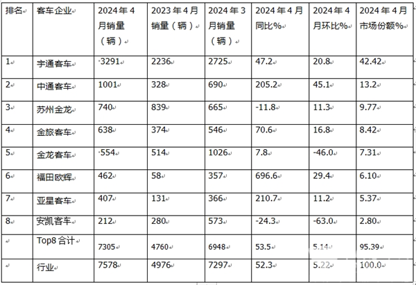 宇通占比超4成强势夺冠 2024年4月传统动力大中型客车销量排行出炉