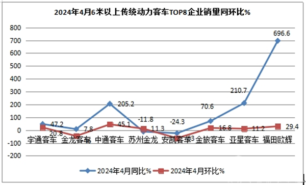 上图表可见,在2024年4月6米以上传统动力客车销量及同比中,TOP8客车企业呈现以下特点: