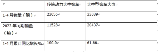 2024年1-4月大中型传统动力客车累计销售23056辆,同比去年1-4月11528辆大涨100%,跑赢今年1-4月大中型客车大盘61.66%的增速近38.34个百分点,说明今年1-4月大中型 客车市场的增长主要是由传统动力的大中型客车市场增长拉动的。