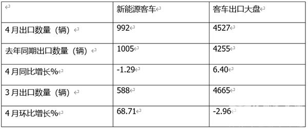 也就是说,今年4月,新能源客车出口同比跑赢、环比跑输客车大盘。