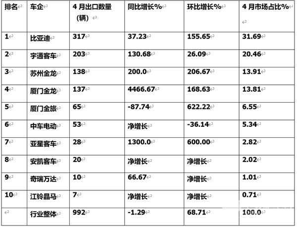 总之,今年4月我国新能源客车出口表现不及客车出口大盘,但环比增幅较高。从竞争格局看,比亚迪、宇通表现较好。