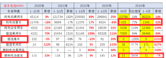 根据截图2数据可知,2024年4月及1-4月各技术路线新能源客车动力电池装机量及同比、占比: