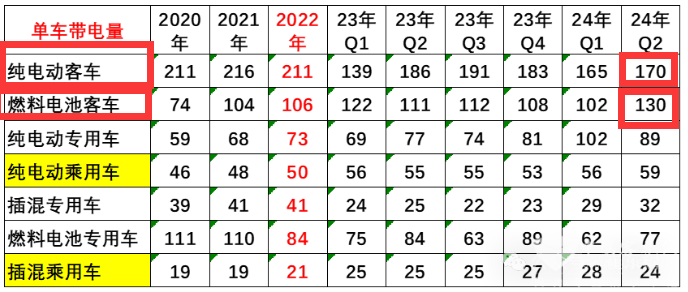 三、纯电动客车单车平均带电量最高,且相对一季度提高;燃料电池客车居第二,相对一季度也提高