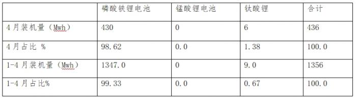上表可见,在2024年4月新能源客车动力电池装机量中,磷酸铁锂电池装机量430Mwh,占比98.62%,占据绝对的主体地位;而钛酸锂电池在2024年4月占比1.38%,锰酸锂没有实现装机;